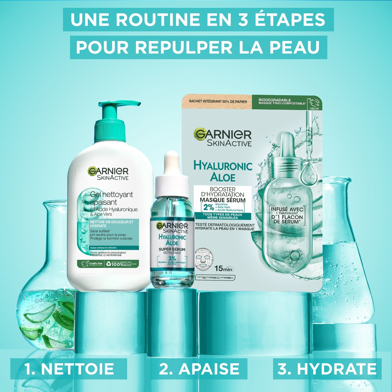 Ce gel nettoyant doux pour le visage enrichi en ACIDE HYALURONIQUE + ALOE VERA + GLYCERINE nettoie en profondeur, hydrate et repulpe pour une sensation d'apaisement et un grain de peau affiné. Cette formule sans sulfate* et au pH neutre, élimine le maquillage en douceur et les impuretés tout en préservant la barrière d'hydratation naturelle de la peau. EFFICACITÉ PROUVÉE** Après la 1ère utilisation, Les impuretés telles que la saleté sont éliminées (100%) La peau paraît apaisée (100%) La peau paraît nourrie (98%) Après 2 semaines, La peau paraît régénérée (98%) La peau paraît hydratée (88%) Le grain de peau est affiné (96%) *Sans tensioactifs sulfatés. **Test consommateur, 60 femmes. Votre peau est nettoyée, hydratée, apaisée et votre grain de peau affinée. EFFICACITÉ PROUVÉE** Après la 1ère utilisation, Les impuretés telles que la saleté sont éliminées (100%) La peau paraît apaisée (100%) La peau paraît nourrie (98%) Après 2 semaines, La peau paraît régénérée (98%) La peau par