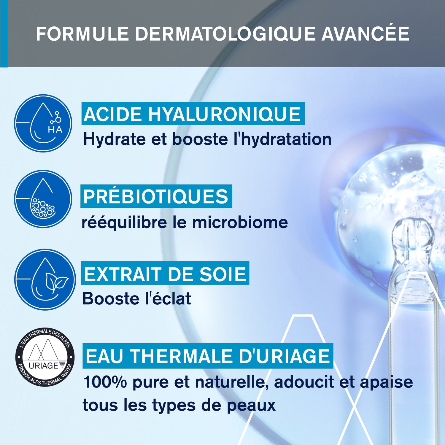 Sa formule exclusive à l'Eau Thermale d'Uriage est enrichie en minéraux, Calcium Ca et Magnésium Mg, pour renforcer la barrière d'hydratation. Boostée en Acide hyaluronique de Haut poids moléculaire, extrait d'arbre à soie et prébiotique, l'Essence d'Eau Éclat hydrate intensément et révèle l'éclat naturel de la peau. Sa texture unique aqueuse fusionne instantanément avec la peau sans laisser de film gras, pour une sensation de fraîcheur vivifiante !