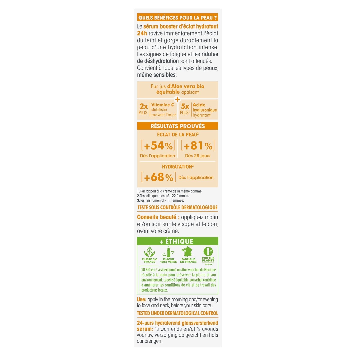 Le sérum booster d'éclat hydratant 24h ravive immédiatement l'éclat du teint et gorge durablement la peau d'une hydratation intense. Les signes de fatigue et les ridules de déshydratation sont atténués. Convient à tous les types de peaux, même sensibles. Formule hautement concentrée en 3 actifs puissants : - Pur jus d'Aloe vera bio équitable apaisant - 2x PLUS¹ Vitamine C stabilisée ravivant l'éclat - 5x PLUS¹ Acide hyaluronique hydratant 1. Par rapport à la crème de la même gamme. RÉSULTATS PROUVÉS ÉCLAT DE LA PEAU² +54% dès l'application +81% dès 28 jours HYDRATATION +68 % dès l'application^3 -35% ridules de déshydratation dès 28 jours² 2. Test clinique mesuré - 22 femmes. 3. Test instrumental - 11 femmes. RÉSULTATS PROUVÉS ÉCLAT DE LA PEAU² +54% Dès l'application +81% Dès 28 jours HYDRATATION +68 % Dès l'application^3 -35% ridules de déshydratation dès 28 jours² 2. Test clinique mesuré - 22 femmes. 3. Test instrumental - 11 femmes. COSMOS ORGANIC, certifié par ECOCERT Greenlife 0% silicone, huile minérale 99% d'origine naturelle 43 % du total des ingrédients sont issus de l'agriculture biologique. Le 1% restant sert à la bonne conservation du produit. + ETHIQUE - SO BiO étic® a sélectionné un Aloe vera bio du Mexique récolté à la main pour préserver la plante et son environnement. Labellisé équitable, son achat contribue à améliorer les conditions de vie et de travail des producteurs locaux. - Flacon 100% verre recyclable - Fabriqué en France - 1% FOR THE PLANET Member