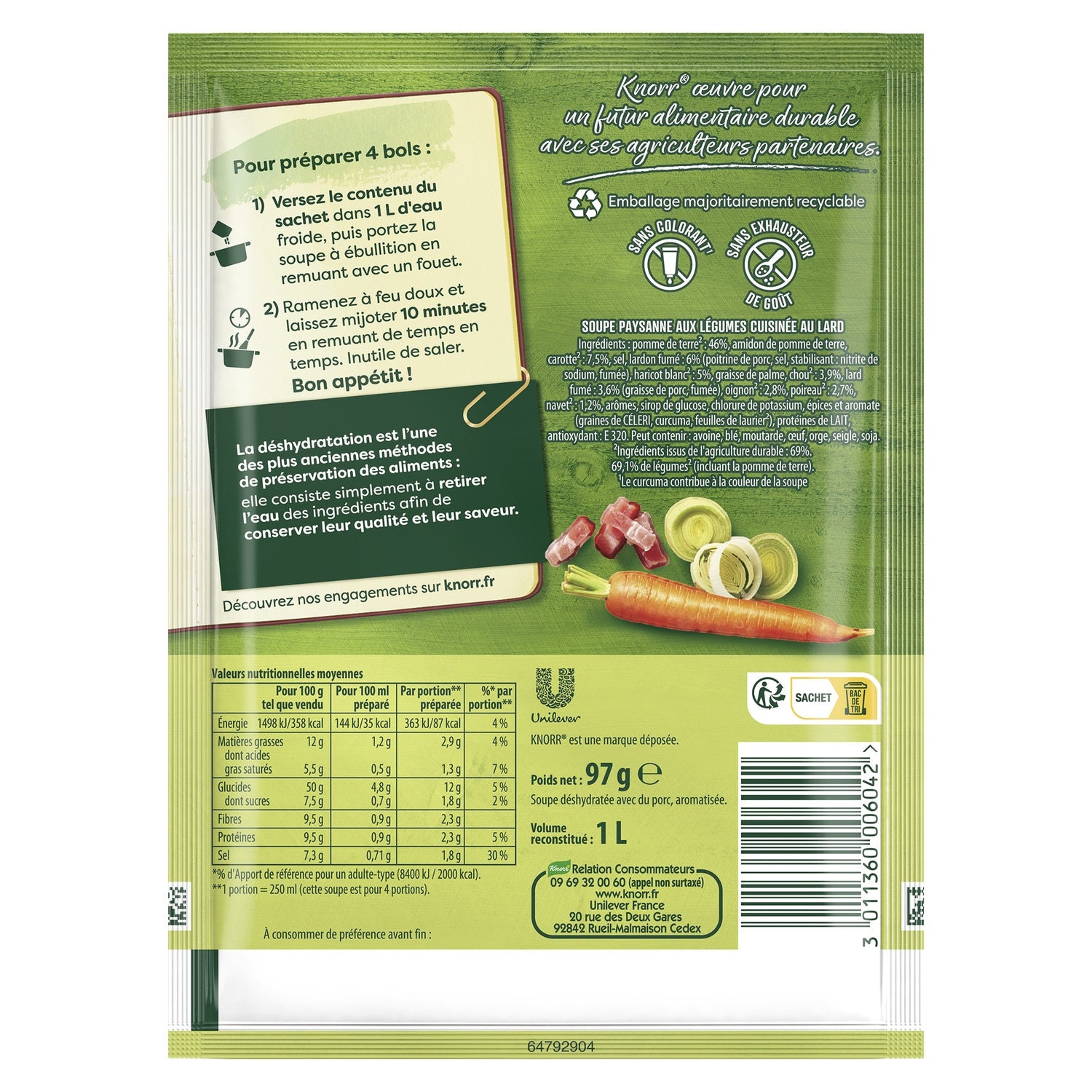 La soupe déshydratée Paysanne aux légumes cuisinés au lard de Knorr ® marie une sélection de bons légumes du potager avec des lardons fumés cuisinés dans un délicieux bouillon aux herbes et au lard.,Avec un mélange de bons légumes, ces soupes Knorr®savoureuses feront la joie de toute la famille.,Un potage préparé avec des ingrédients issus de l'agriculture durable, sans colorant, ni exhausteur de gout.,Mais, c'est quoi la déshydratation ? Cela consiste à retirer l'eau des ingrédients de nos soupes afin de conserver leur qualité et leur saveur sans ajout de conservateur.,Ce format vous permet de réaliser 4 généreux bols de soupe de légumes au lard.,Une recette de soupe réconfortante prête en 5 minutes : Versez le contenu du sachet dans 1 L d'eau froide puis portez à ébullition. Laissez mijoter 5 min. C'est prêt !