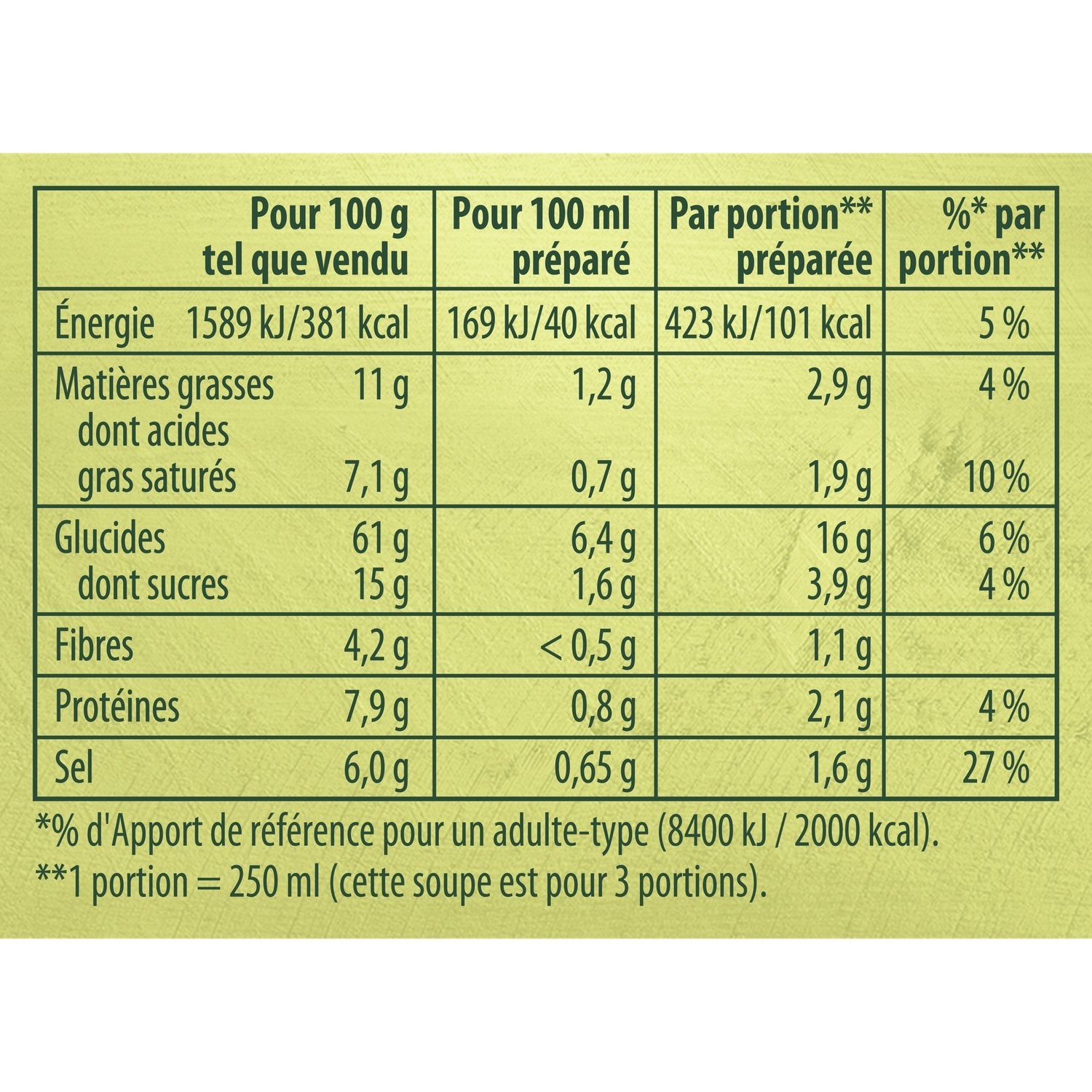 Ingrédients : amidons (pomme de terre, pois), lactosérum (LAIT), pomme de terre³ : 15%, farine de BLÉ, graisse de palme, poireau³ : 8,1%, oignon³ : 7,3%, sel, arômes, chlorure de potassium, protéines végétales hydrolysées, extrait de levure, épinard³, sirop de glucose, protéines de LAIT, épices et aromate (poivre, curcuma, ail), jus de citron (jus de citron, maltodextrine). Peut contenir : avoine, CELERI, MOUTARDE, ŒUF, orge, seigle, SOJA. ³Légumes issus de l'agriculture durable : 31%.