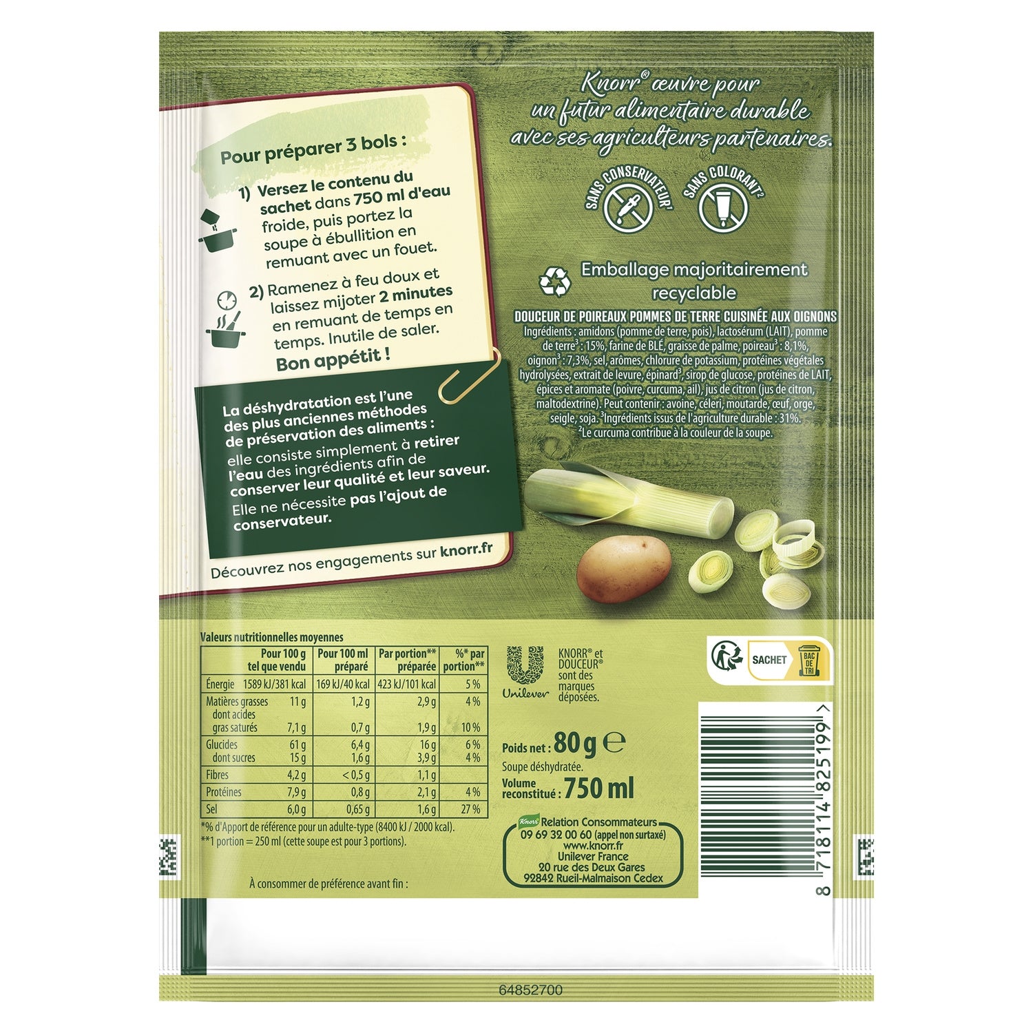 Découvrez la délicieuse soupe déshydratée douceur de poireaux pommes de terre de Knorr ®, une soupe qui marie le fondant du poireau à la douceur de la pomme de terre.,Tout le bon goût des légumes dans ces onctueuses soupes Knorr® pour le plaisir des petits comme des plus grands.,Un potage préparé avec des poireaux et des pommes de terre issus de l'agriculture durable, sans colorant, sans conservateur, ni exhausteur de goût.,Mais, c'est quoi la déshydratation ? Cela consiste à retirer l'eau des ingrédients de nos soupes afin de conserver leur qualité et leur saveur sans ajout de conservateur.,Ce format vous permet de réaliser 3 généreux bols de soupe au bon goût de légume.,Une recette de soupe réconfortante prête en 2 minutes : Faites bouillir 750 ml d'eau, ramenez à feu doux et versez le contenu du sachet. Laissez mijoter 2 min. C'est prêt !