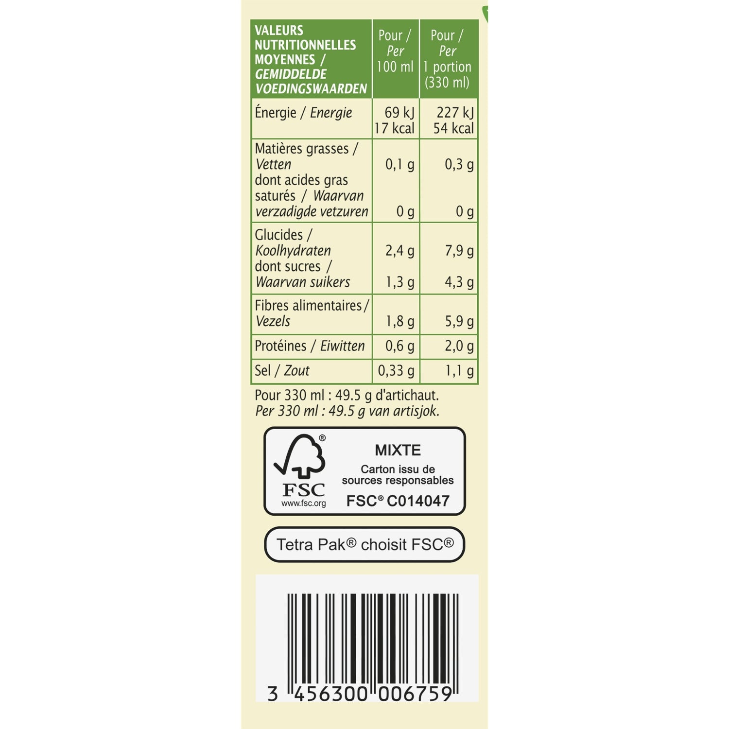 INGRÉDIENTS : eau, légumes* 47% (artichauts* 15%, courgettes*, CELERI-rave*, oignons*, topinambour*), persil*, sel, ail*, curcuma*, thym*. *Produits issus de l'agriculture biologique. Peut contenir des traces de GLUTEN, CRUSTACES, POISSONS, MOLLUSQUES, LAIT, MOUTARDE, OEUFS, SOJA et FRUITS A COQUE.