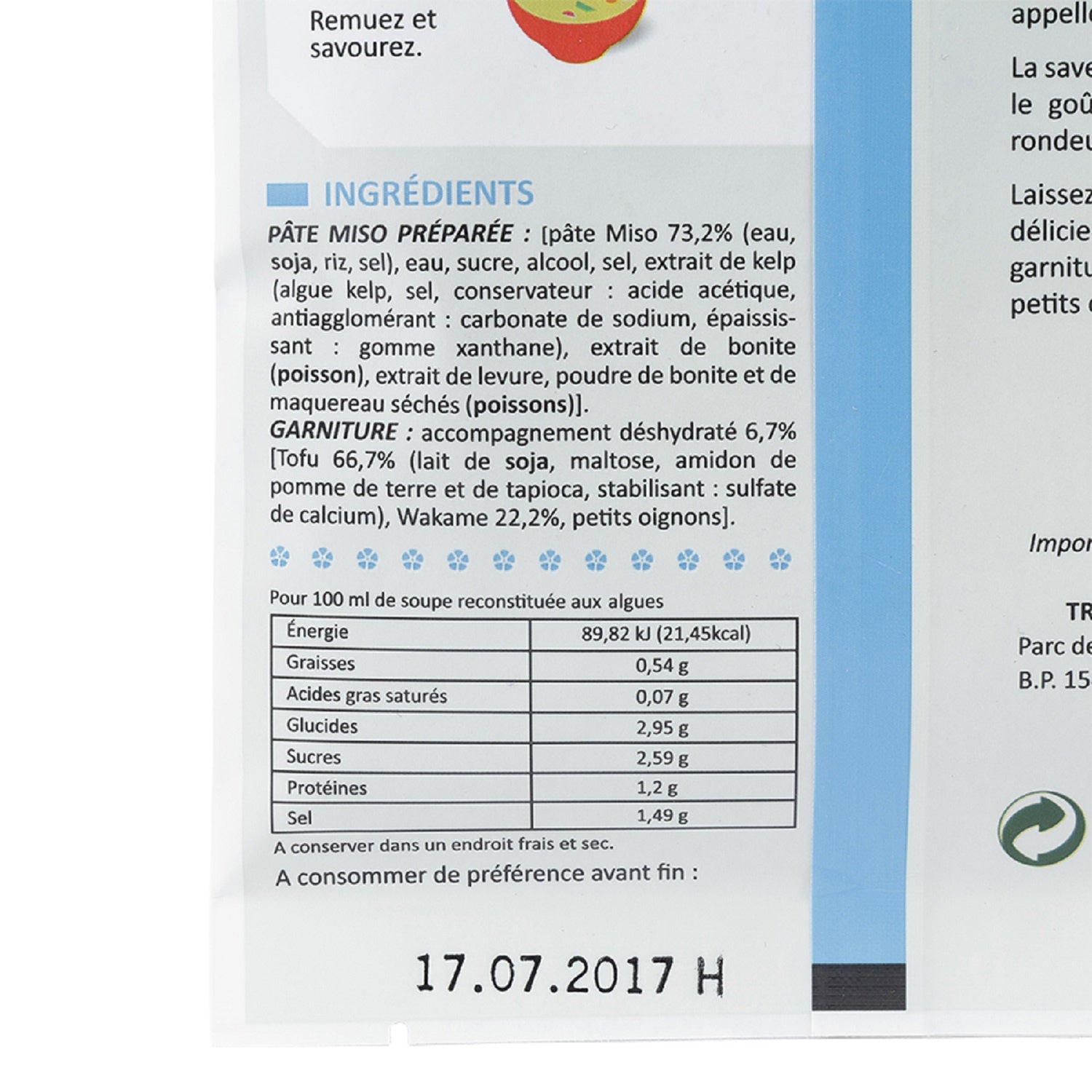 PÂTE MISO PRÉPARÉE : Préparation au miso 93,3% pâte miso 74,9% (soit 69,9% du produit total) (eau, riz, graines de SOJA, sel), eau, alcool, sucre, poudre de bonite séchée (POISSON), sel, extrait d'algues brunes (Saccharina japonica), extrait de levure. GARNITURE : Accompagnement déshydraté 6,7% tofu 66,7% (soit 4,5% du produit total) (jus de SOJA, stabilisant : sulfate de calcium), algues wakame 22,2% (soit 1,5% du produit total) (Undaria pinnatifida), petits oignons.