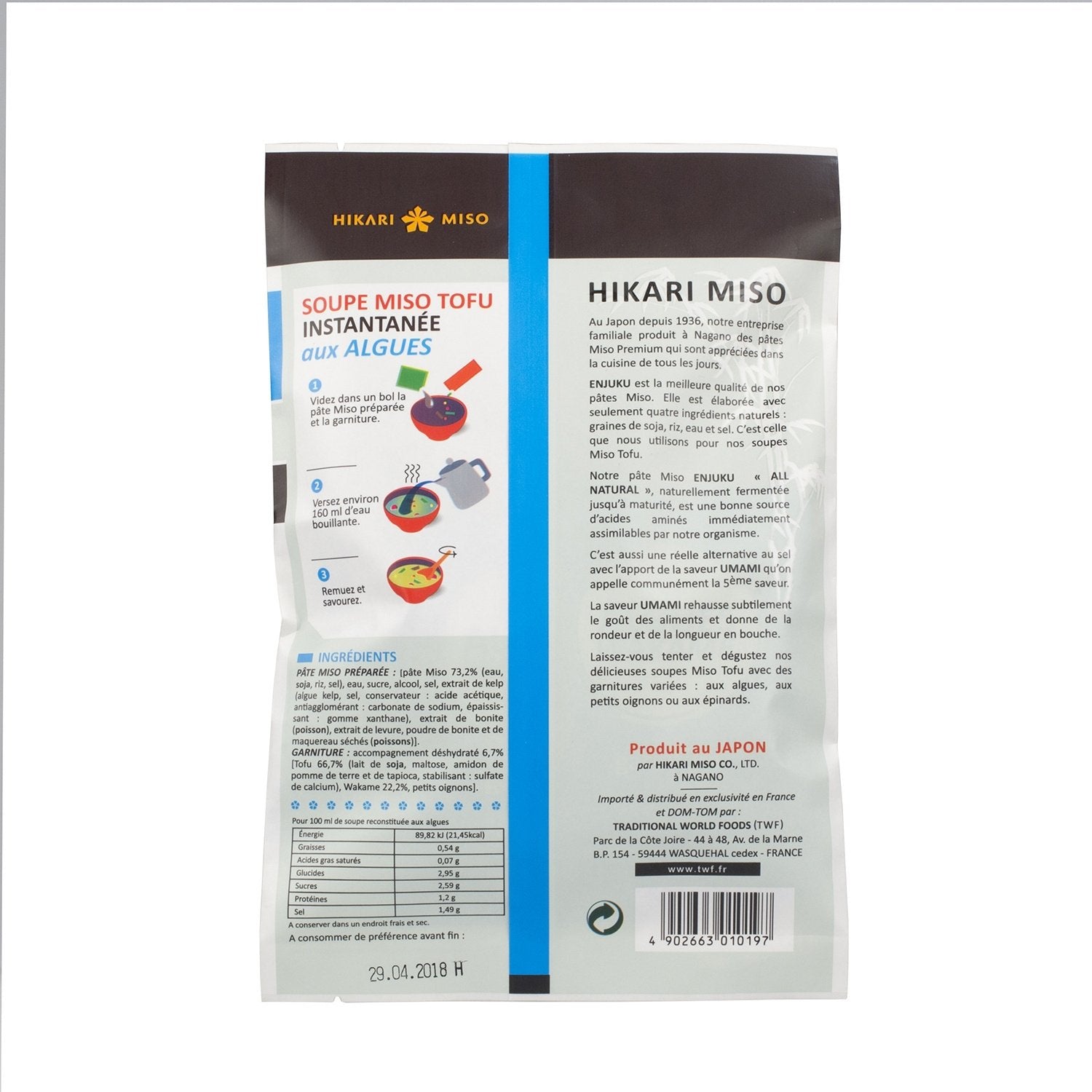 DétailsSoupe miso aux algues wakame Poids unitaire : 69.5 grs Code-barres EAN : 4902663010197 Marque : HIKARI MISO