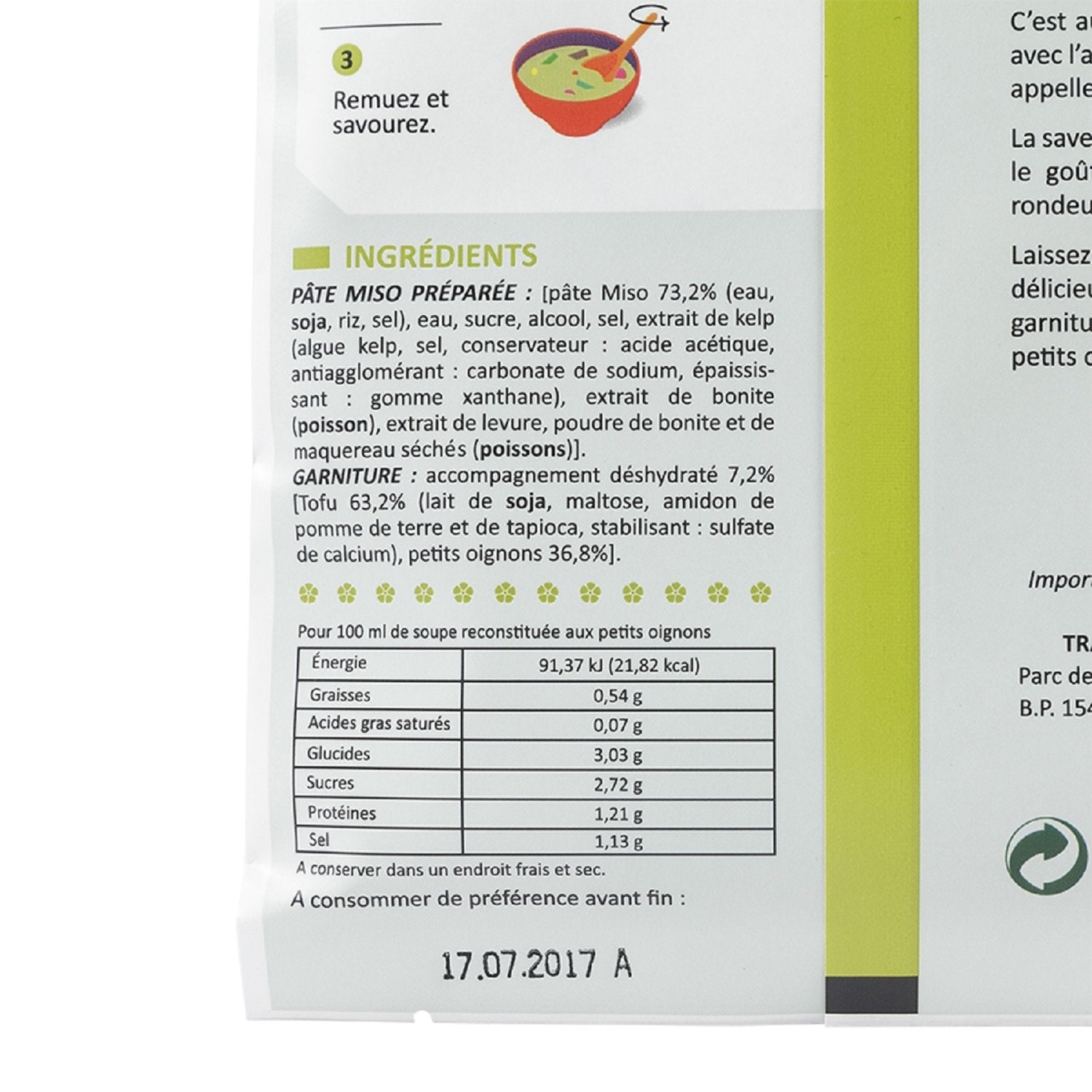 PÂTE MISO PRÉPARÉE : Préparation au miso 92,8% pâte miso 74,9% (soit 69,5% du produit total) (eau, riz, graines de SOJA, sel), eau, alcool, sucre, poudre de bonite séchée (POISSON), sel, extrait d'algues brunes (Saccharina japonica), extrait de levure GARNITURE : Accompagnement déshydraté 7,2% tofu 63,2% (soit 4,6% du produit total) (jus de SOJA, stabilisant : sulfate de calcium), petits oignons 36,8% (soit 2,7% du produit total).