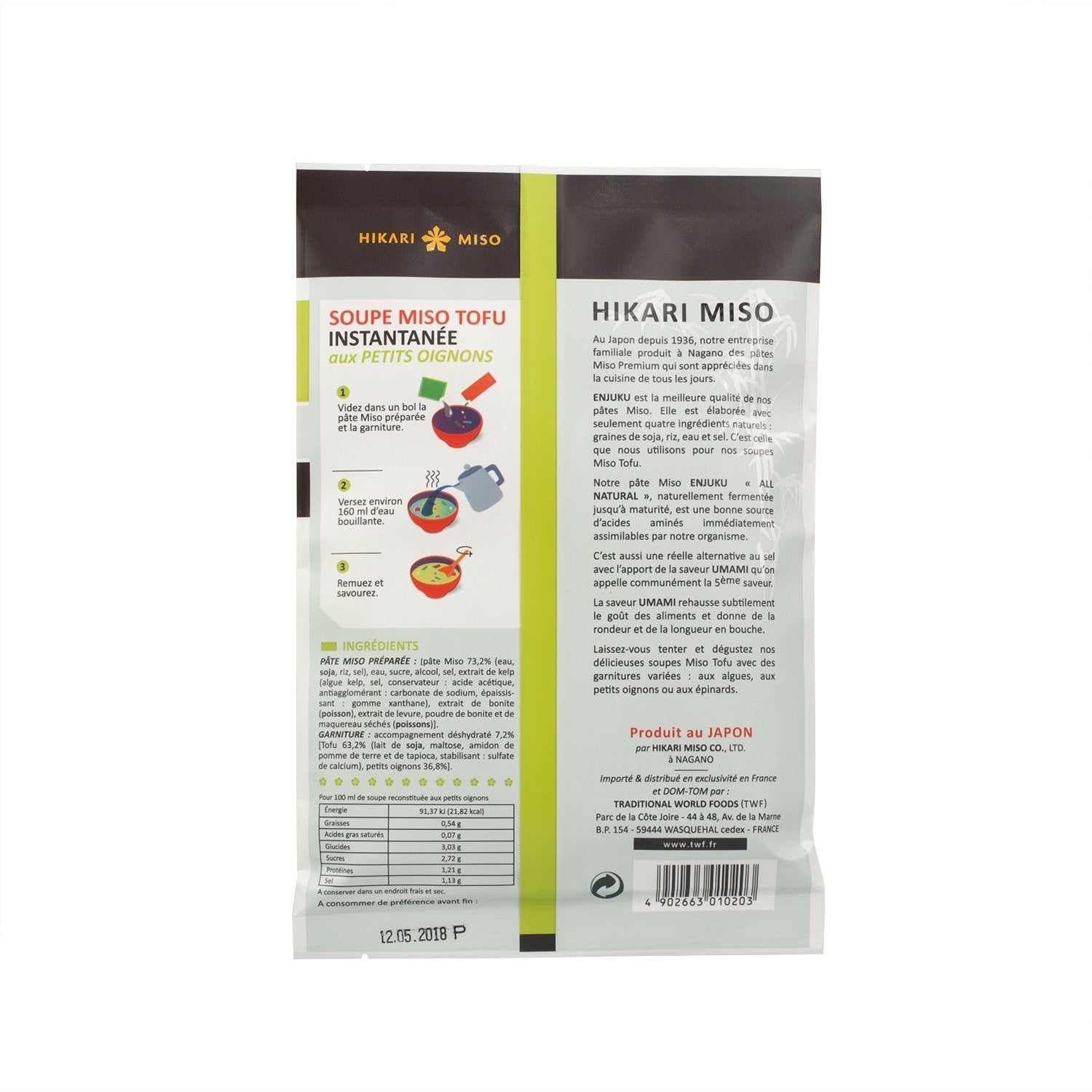 DétailsSoupe miso aux oignons Poids unitaire : 69.8 grs Code-barres EAN : 4902663010203 Marque : HIKARI MISO