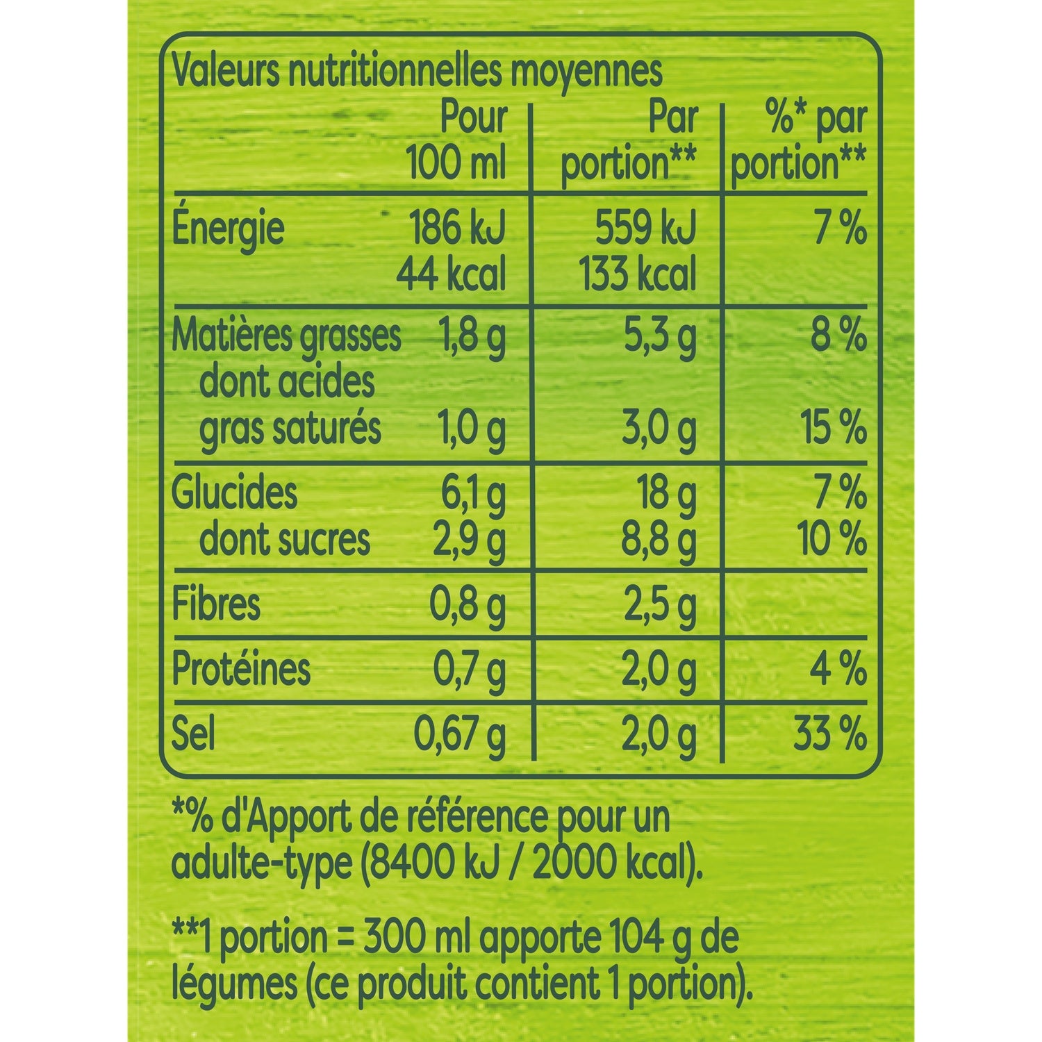 NOTRE RECETTE Ingrédients : eau, carotte¹ : 15%, tomate¹ : 10%, pomme de terre¹ : 6%, CRÈME fraîche : 4,1%, courge¹ : 3%, amidon de maïs, oignon¹ : 2,1%, poireau¹ : 1,8%, sucre de canne, CELERI-RAVE¹ : 1,1%, petit pois¹ : 1,1%, sel, BEURRE, aromates (ail, racine de livèche). Peut contenir : céréales contenant du GLUTEN, MOUTARDE, ŒUF, SOJA. ¹Légumes issus de l'agriculture durable. 40,1% de légumes¹ (incluant la pomme de terre).