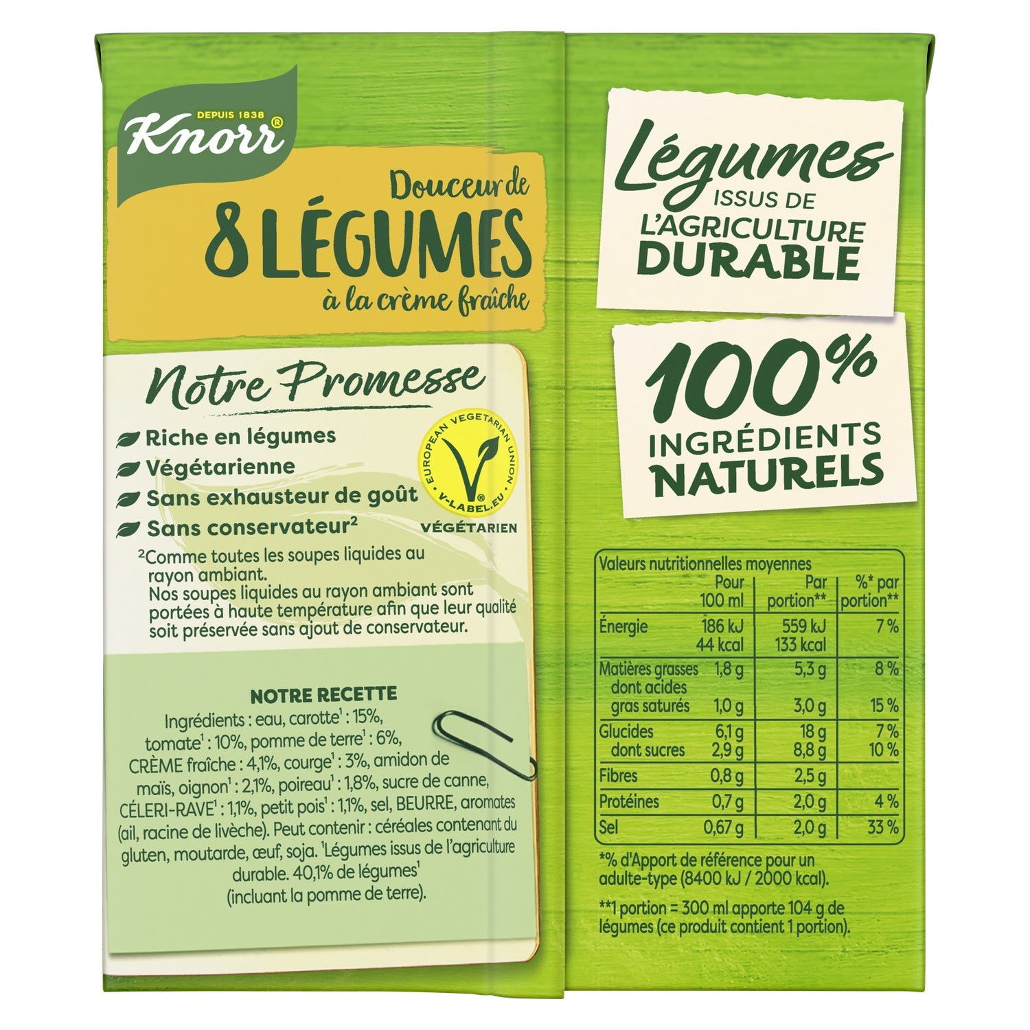 Découvrez la soupe Douceur de 8 légumes de Knorr®, qui associe le bon goût des légumes à la douceur de la crème fraîche pour vous offrir un moment délicieusement gourmand.,Une soupe nutri-score B cuisinée avec 100% d'ingrédients naturels et des légumes issus de l'agriculture durable, pour un repas simple et riche en goût.,Cette soupe végétarienne et riche en légumes est préparée sans exhausteur de goût, sans colorant et sans conservateur (comme toutes les soupes liquides au rayon ambiant).,Nos briques de soupe, majoritairement recyclables et certifiées par les labels FSC® et ASI®, soutiennent l'approvisionnement durable en carton et en aluminium.,Ce format 30 cl vous permet de servir un généreux bol de soupe.,Une recette de soupe réconfortante, facile et rapide à préparer : secouez, versez, réchauffez sans porter à ébullition… et dégustez !