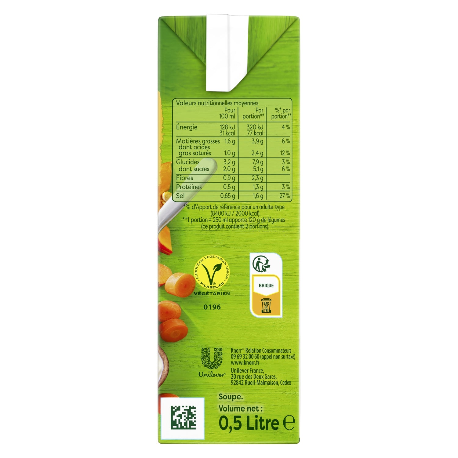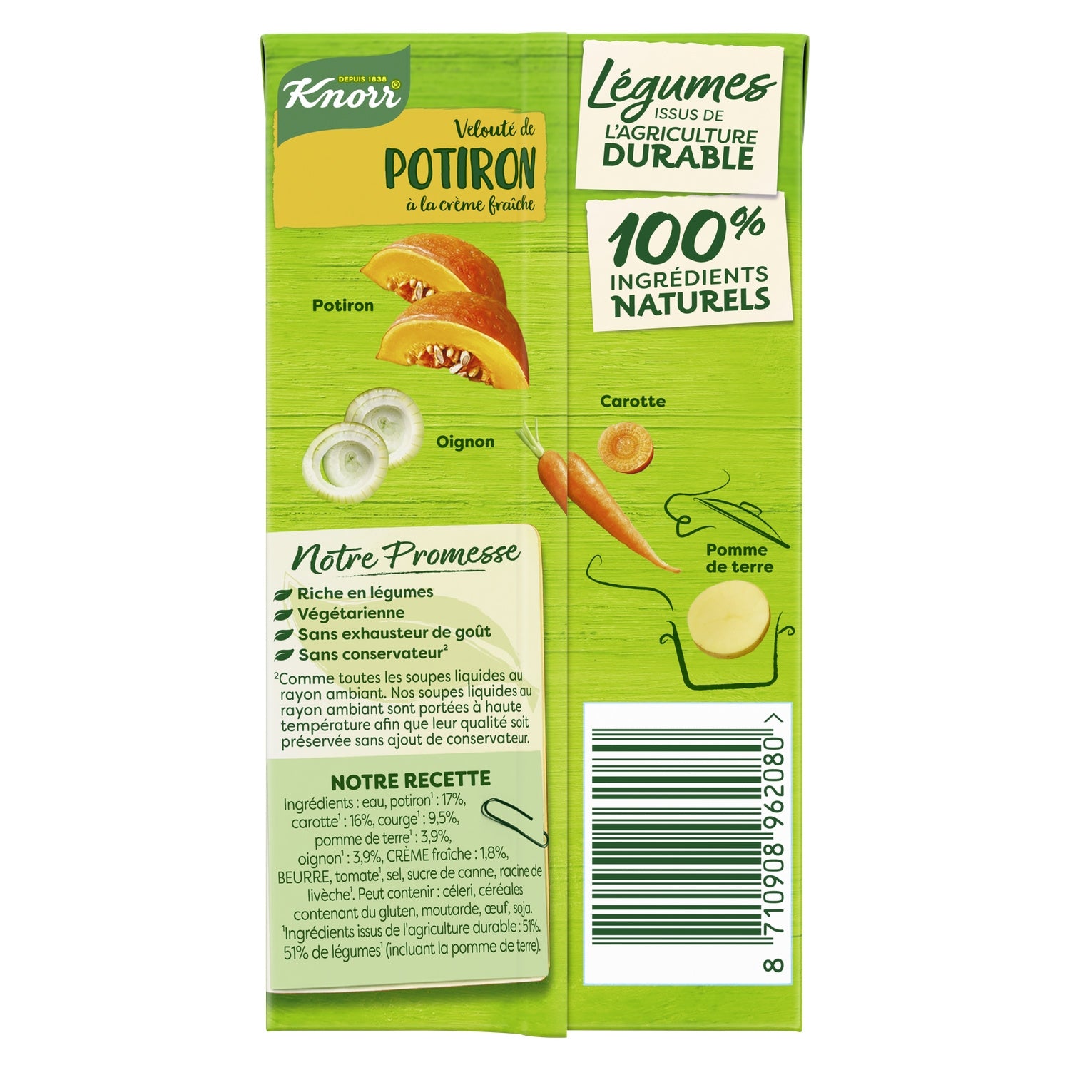 Retrouvez le bon goût du potiron et la douceur de la crème fraiche de la soupe Velouté de Potiron de Knorr®, pour un moment délicieusement gourmand.,Une soupe Knorr ® cuisinée avec 100% d'ingrédients naturels et des légumes issus de l'agriculture durable, pour un repas simple et riche en goût.,Cette soupe végétarienne, nutri-score B et riche en légumes est préparée sans exhausteur de goût, sans colorant et sans conservateur (comme toutes les soupes liquides au rayon ambiant).,Nos briques de soupe, majoritairement recyclables et certifiées par les labels FSC® et ASI®, soutiennent l'approvisionnement durable en carton et en aluminium.,Ce format 50 cl vous permet de servir 2 généreux bols de soupe de légumes.,Une recette de soupe réconfortante facile et rapide à préparer : secouez, versez, réchauffez sans porter à ébullition… et dégustez !