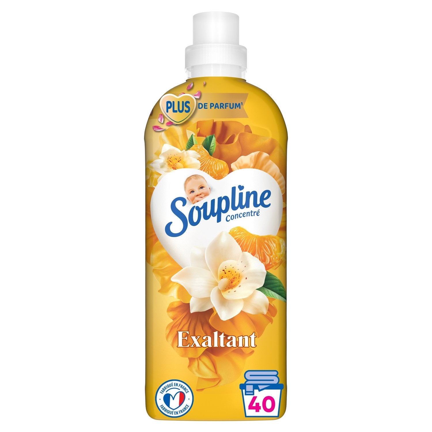 Assouplissant Soupline Concentré Exaltant aux notes de mandarine et vanille. Maintenant avec la technologie de parfum Emotiboost qui améliore votre humeur. L'assouplissant est doté d'une technologie révolutionnaire de parfum 3D.