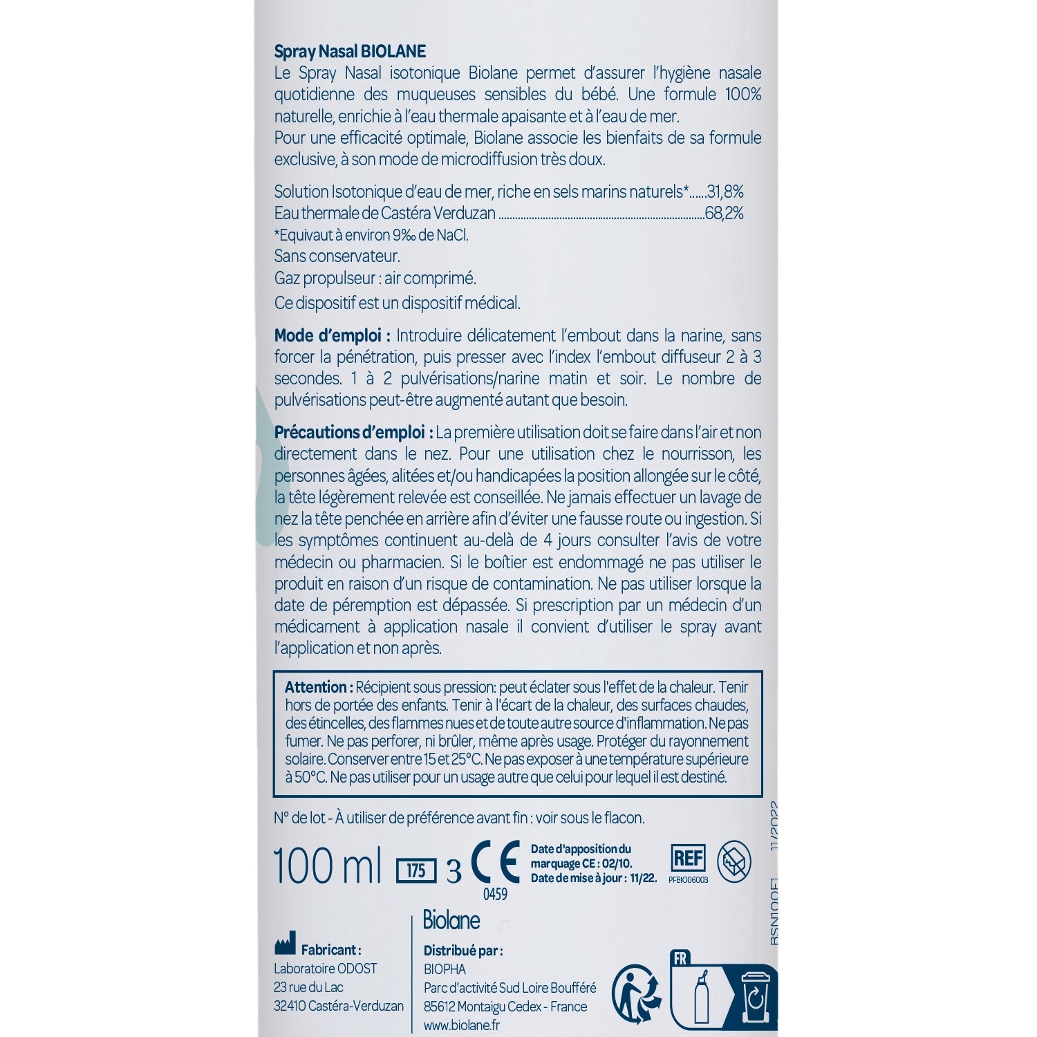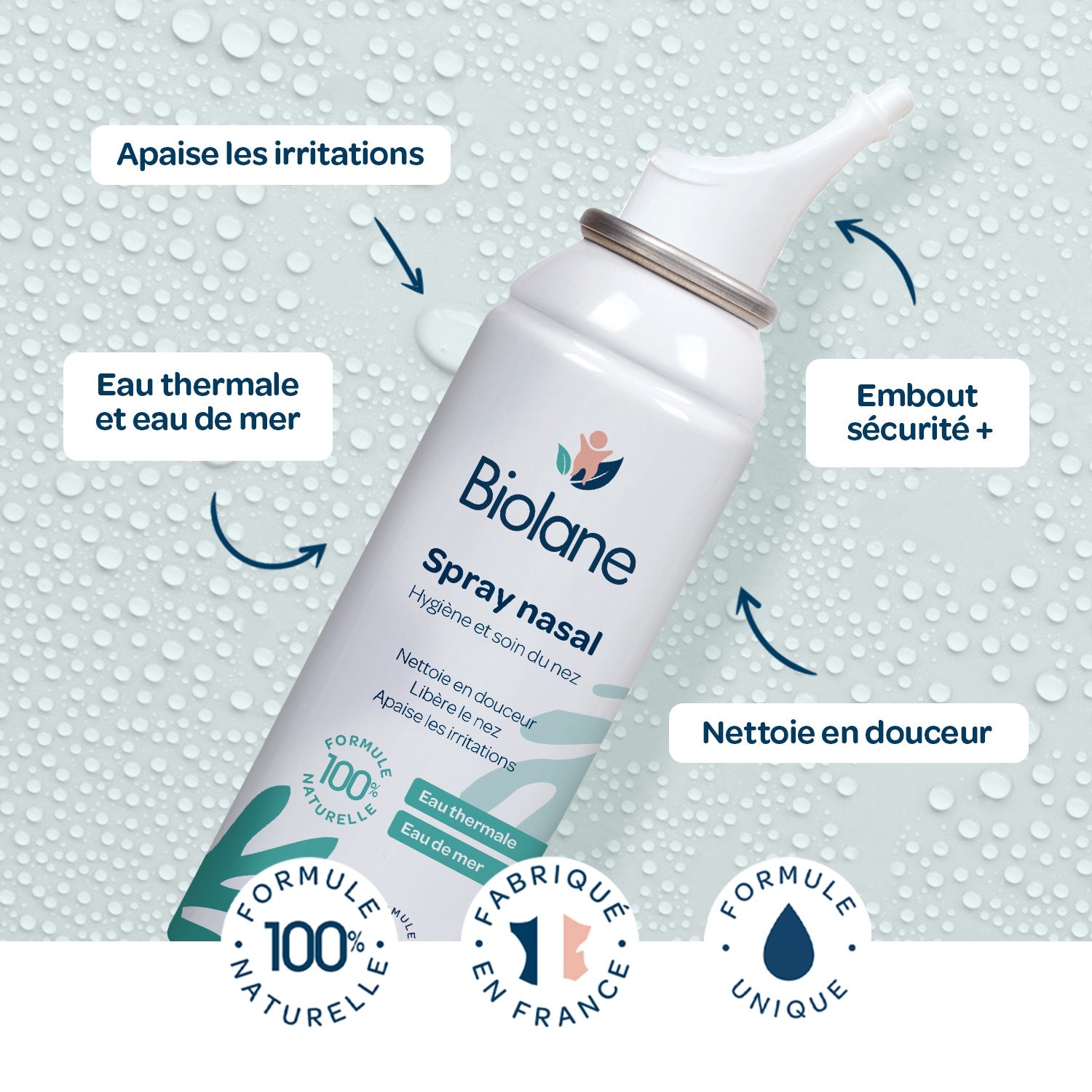 Le spray nasal Biolane est une formule exclusive, composée de deux ingrédients 100% naturels : • Eau thermale qui apaise les irritations et aide la muqueuse nasale à se rétablir. • Eau de mer qui fluidifie les sécrétions pour nettoyer efficacement le nez et éliminer les impuretés (allergènes). Sans conservateurs, sans ajout de gaz dans la formule. Un embout développé pour la plus grande sécurité des bébés. Un mode de micro diffusion doux, utilisable en multi-position.