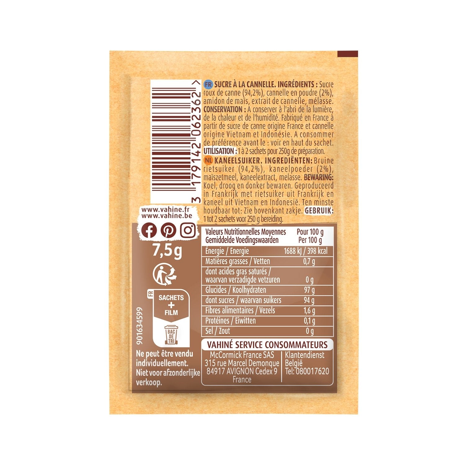 5 sachets pack Notes épicées & boisées Fabriqué en France Sucre de canne origine France et Cannelle origine Vietnam et Indonésie