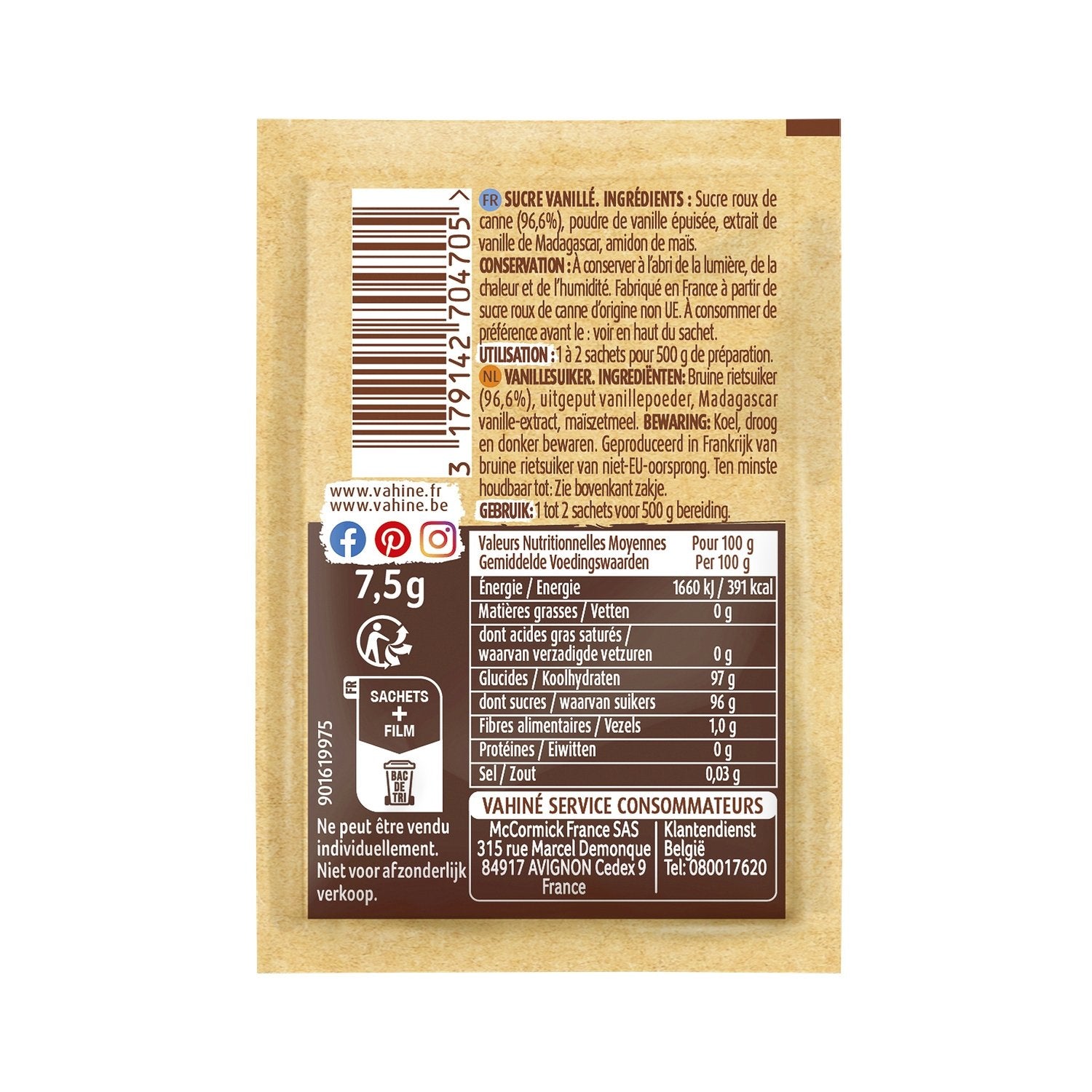 Ingrédients : sucre roux de canne (96,6%), poudre de vanille épuisée, extrait de vanille de madagascar, amidon de maïs.