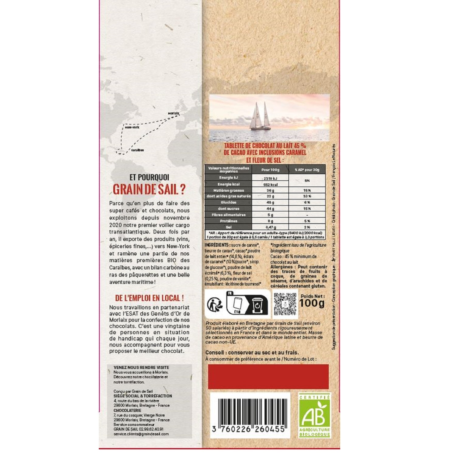 Tablette de Chocolat Lait Grain de Sail Caramel Fleur de Sel Bio GRAIN DE SAIL