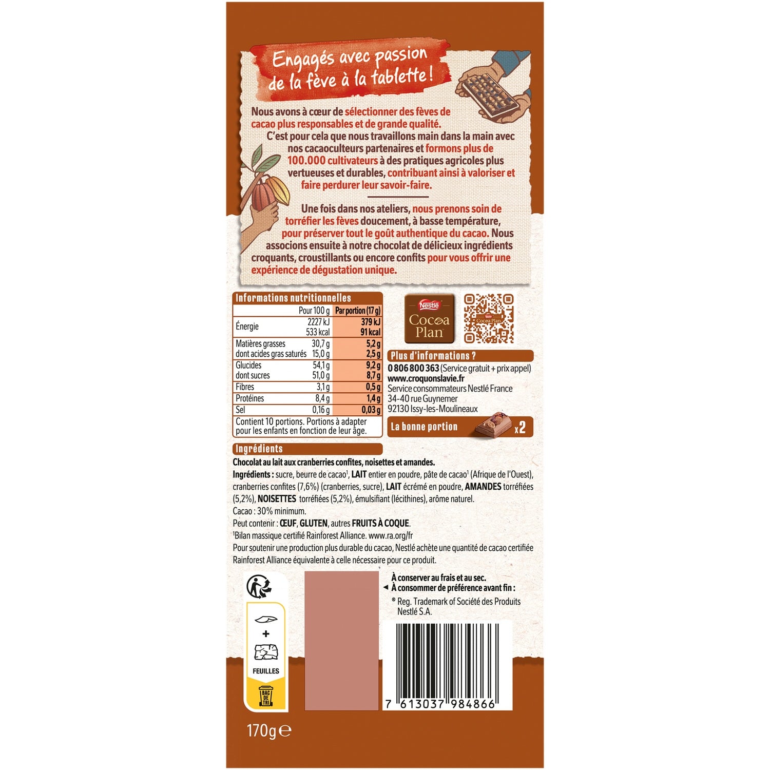 Ingrédients : sucre, beurre de cacao¹, LAIT entier en poudre, pâte de cacao¹ (Afrique de l'Ouest), cranberries confites (7,6%) (cranberries, sucre), LAIT écrémé en poudre, AMANDES torréfiées (5,2%), NOISETTES torréfiées (5,2%), émulsifiant (lécithines), arôme naturel. Cacao : 30% minimum. Peut contenir : ŒUF, GLUTEN, autres FRUITS A COQUE. ¹Bilan massique certifié Rainforest Alliance. www.ra.org/fr.