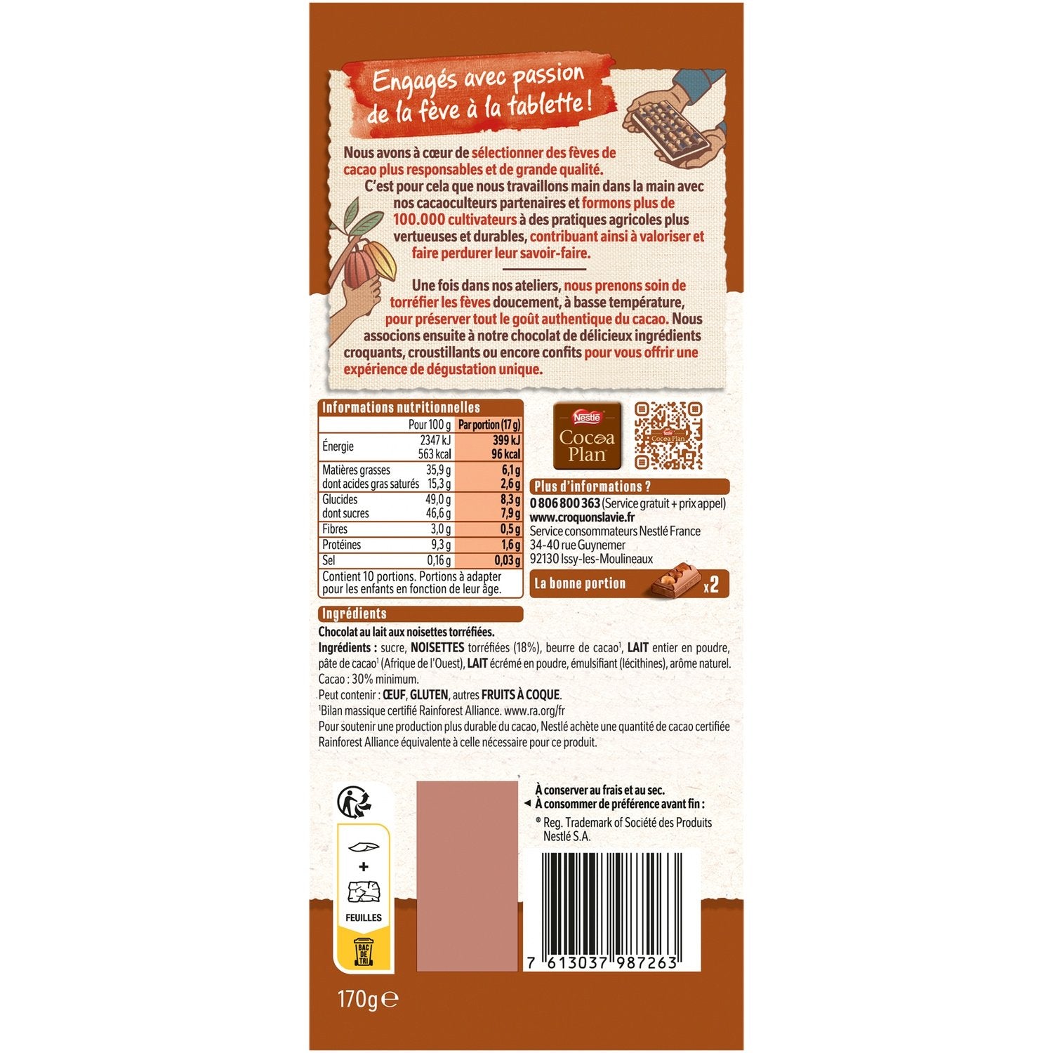 Chocolat pur beurre de cacao & sans arôme artificiel,Noisettes entières torréfiées par nos soins,Nestlé s'engage avec Rainforest Alliance pour soutenir les cultivateurs de cacao,Fèves de cacao soigneusement sélectionnées dans le cadre du Plan Cacao Nestlé