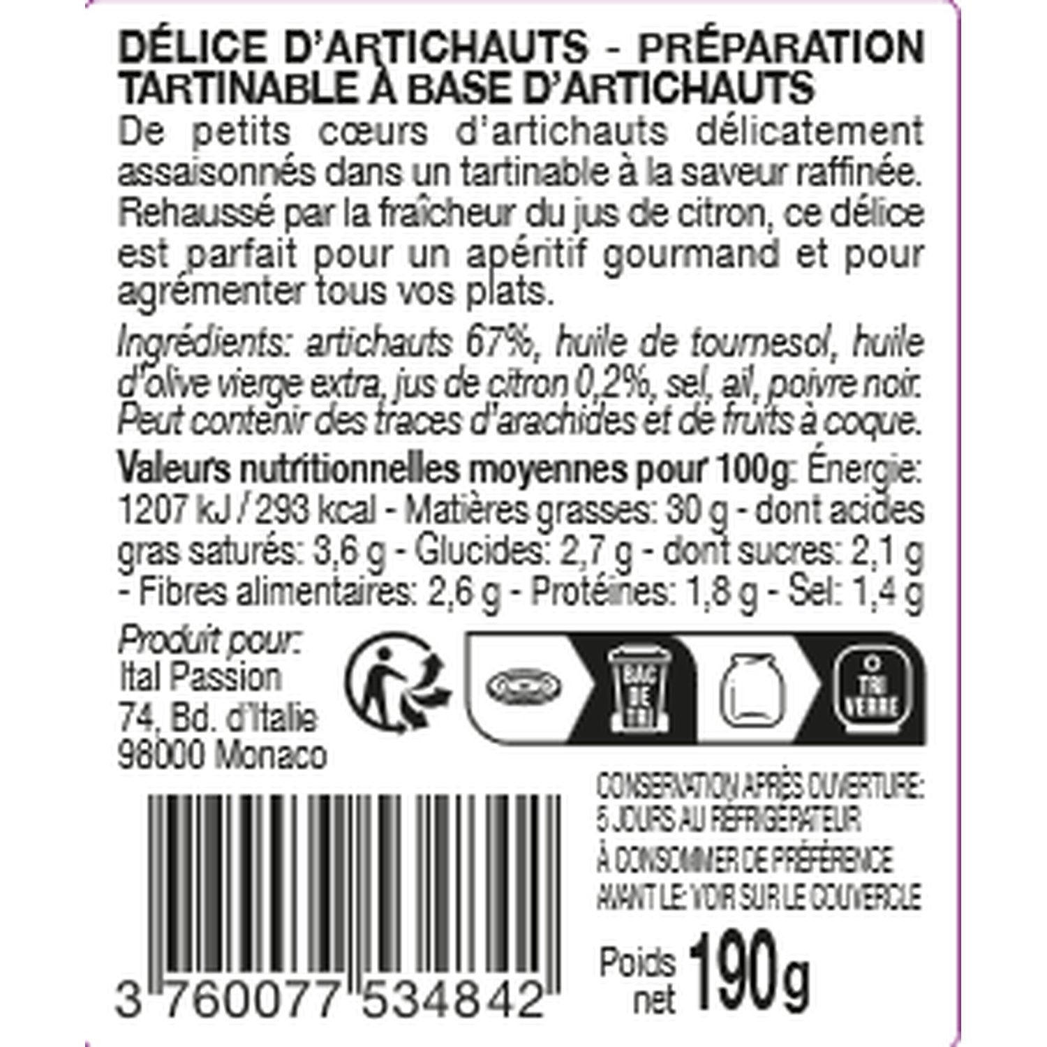 Ingrédients : Artichauts (67%), huile de tournesol, huile d'olive vierge extra, jus de citron, sel, ail, poivre noir.