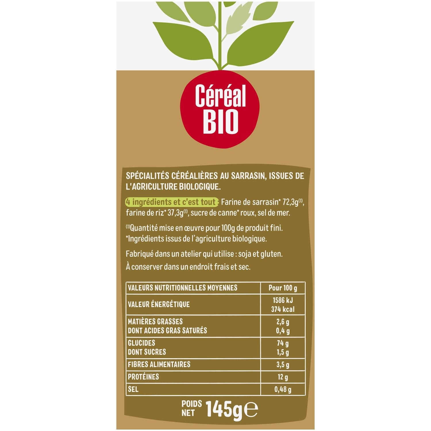 Farine de sarrasin* 72,3g (1) , farine de riz* 37,3g (1) , sucre de canne* roux, sel de mer. (1) Quantité mise en œuvre pour 100g de produit fini, * Ingrédients issus de l'agriculture biologique Fabriqué dans un atelier qui utilise SOJA, GLUTEN