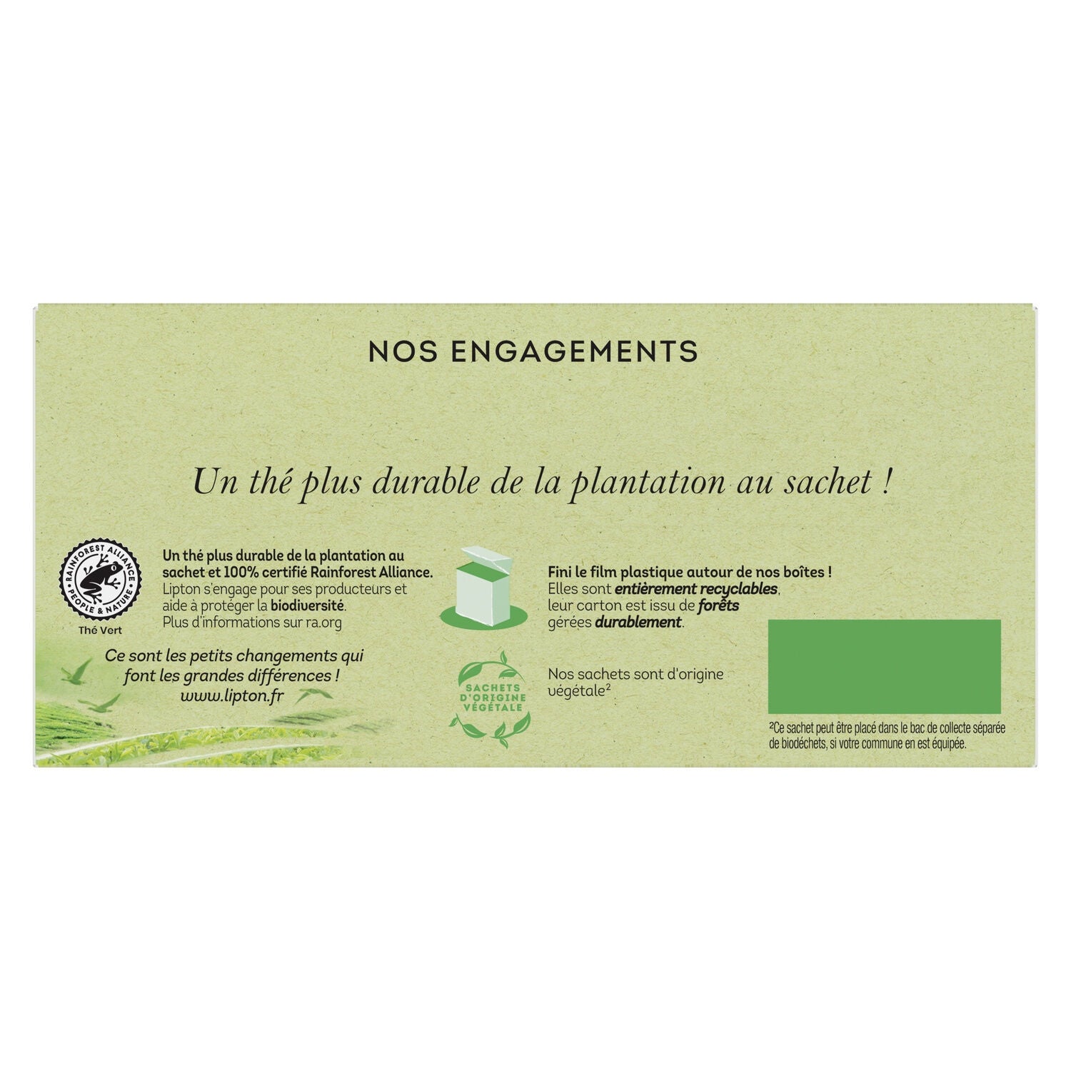 Lipton® continue d'innover. En France, nos feuilles de thé sont certifiées Rainforest Alliance™. En soutenant les petits agriculteurs, nous pouvons assurer la durabilité de la culture du thé, de la récolte à votre tasse.