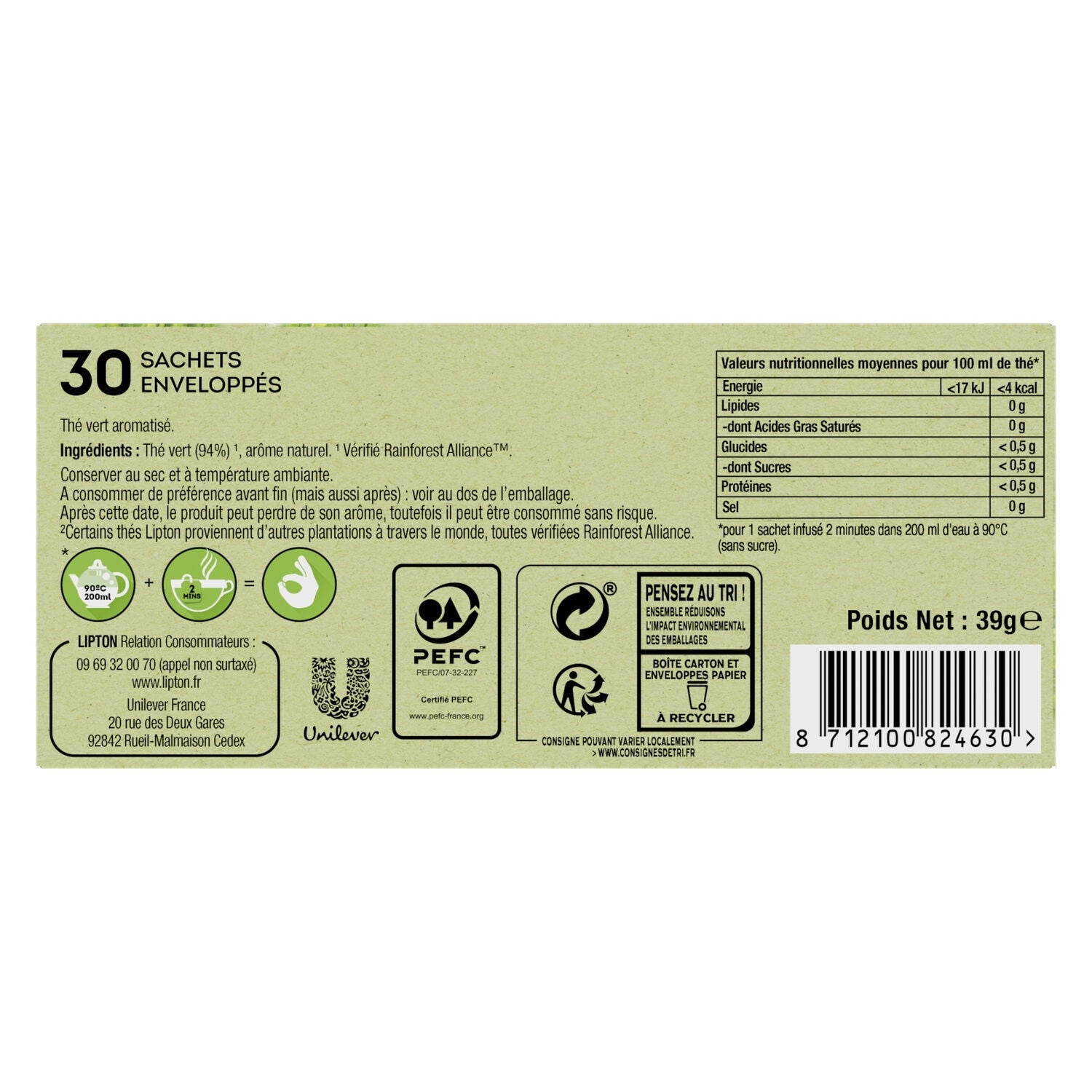 DétailsThé vert aromatisé Poids unitaire : 82 grs Code-barres EAN : 8712100824630 Marque : LIPTON
