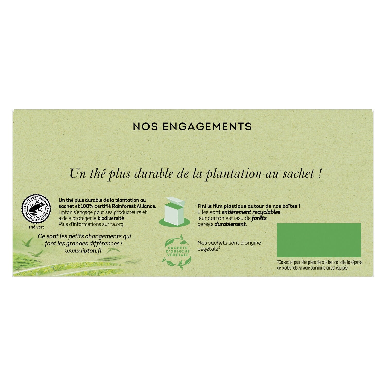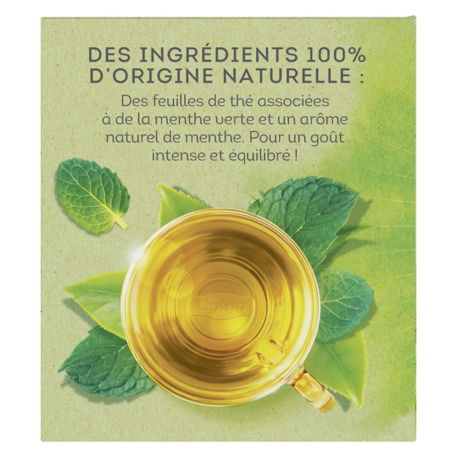 Les 30 sachets de Thé Vert Menthe Lipton® vous accompagnent pour une pause rafraîchissant et délicatement parfumée.,Tout le savoir-faire de Sir Thomas Lipton dans des sachets de thé vert aromatisés à la menthe, pour un goût authentique et frais.,Profitez de toutes les vertues anti-oxydante du thé vert et du coup délicat de la menthe. Idéal en fin de repas, ce thé aide à la digestion.,Pour une dégustation parfaite, versez 200 ml d'eau à 90 °C, sans lait ni sucre et laissez infuser votre thé menthe pendant 2 à 3 mn selon l'intensité désirée.,Les feuilles de ce thé ont été sélectionnées avec attention pour vous offrir du thé de grande qualité.,Les feuilles du Thé Menthe Lipton® sont issues de plantations vérifiées Rainforest Alliance.