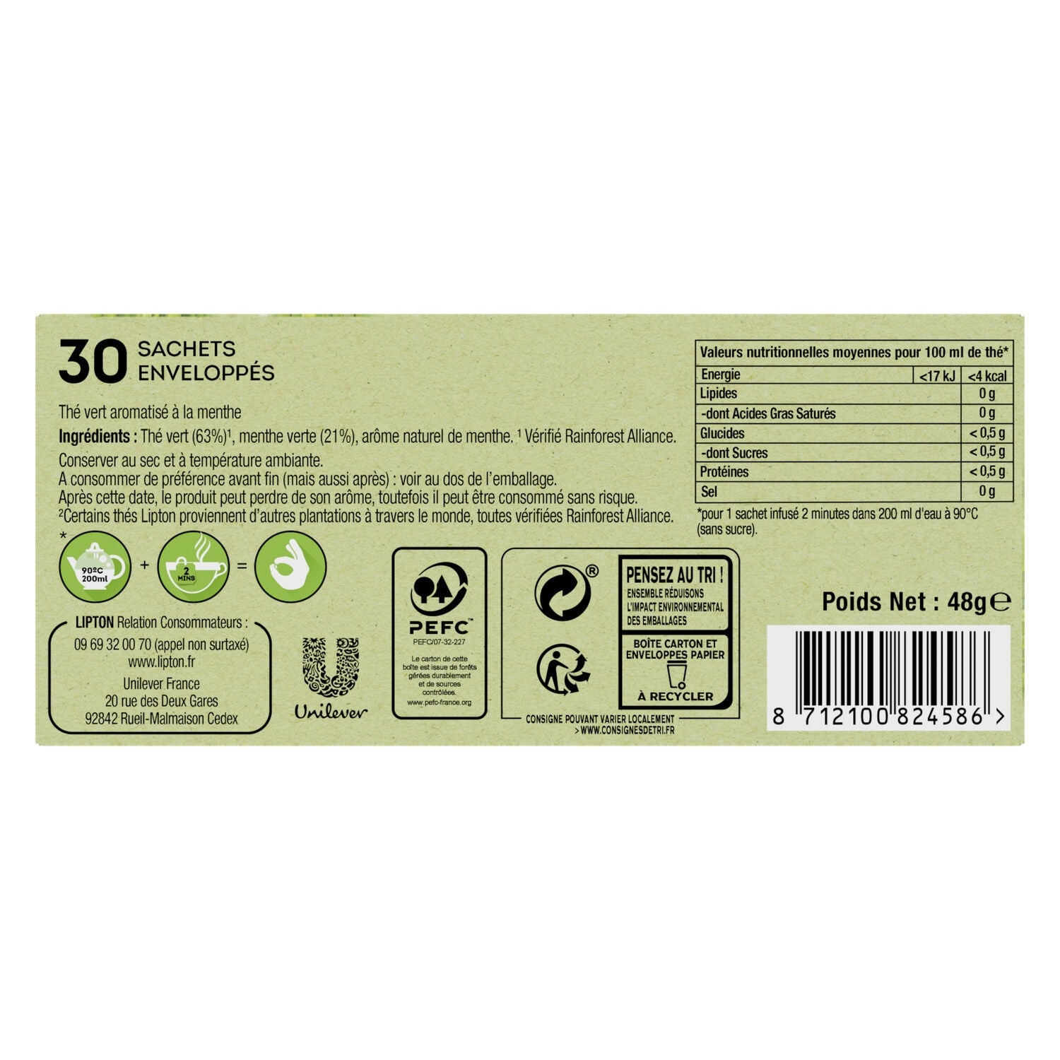DétailsThé vert aromatisé à la menthe Poids unitaire : 94 grs Code-barres EAN : 8712100824586 Marque : LIPTON
