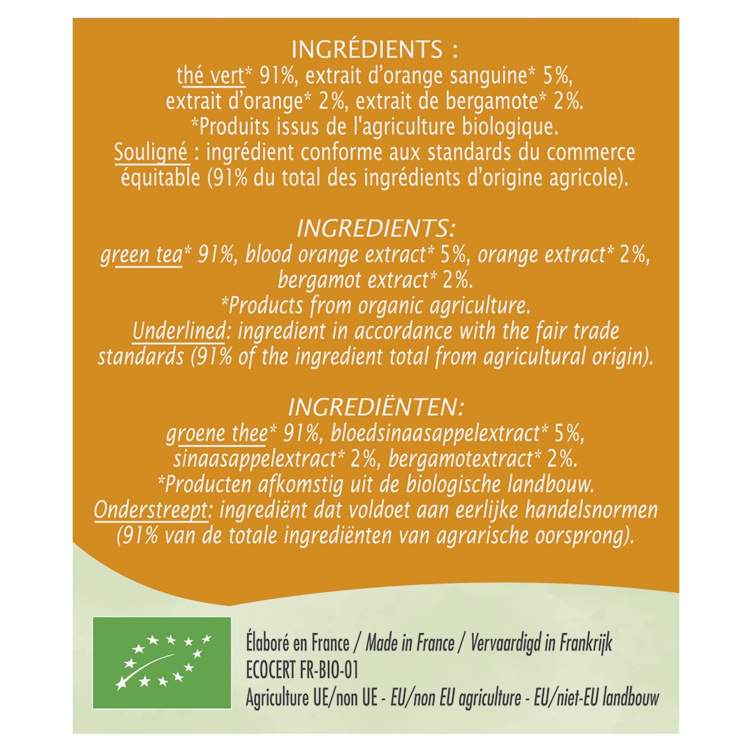 INGRÉDIENTS : thé vert* 91%, extrait d'orange sanguine* 5%, extrait d'orange* 2%, extrait de bergamote* 2%. *Produits issus de l'agriculture biologique. Souligné : ingrédient conforme aux standards du commerce équitable (91% du total des ingrédients d'origine agricole).