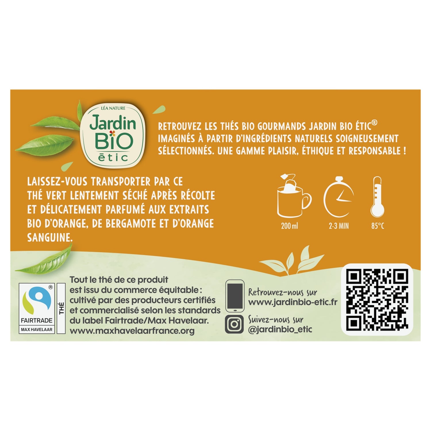 Retrouvez les thés bio gourmands Jardin BiO étic® imaginés à partir d'ingrédients naturels soigneusement sélectionnés. Une gamme plaisir, éthique et responsable ! Laissez-vous transporter par ce de thé vert lentement séché après récole et délicatement parfumé aux extraits bio d'orange, de bergamote et d'orange sanguine. Equitable Fabriqué en France 1% pour la planète Film protecteur, infusettes et étiquette compostables Etui carton et sachet de protection recyclables BIO 20 sachets