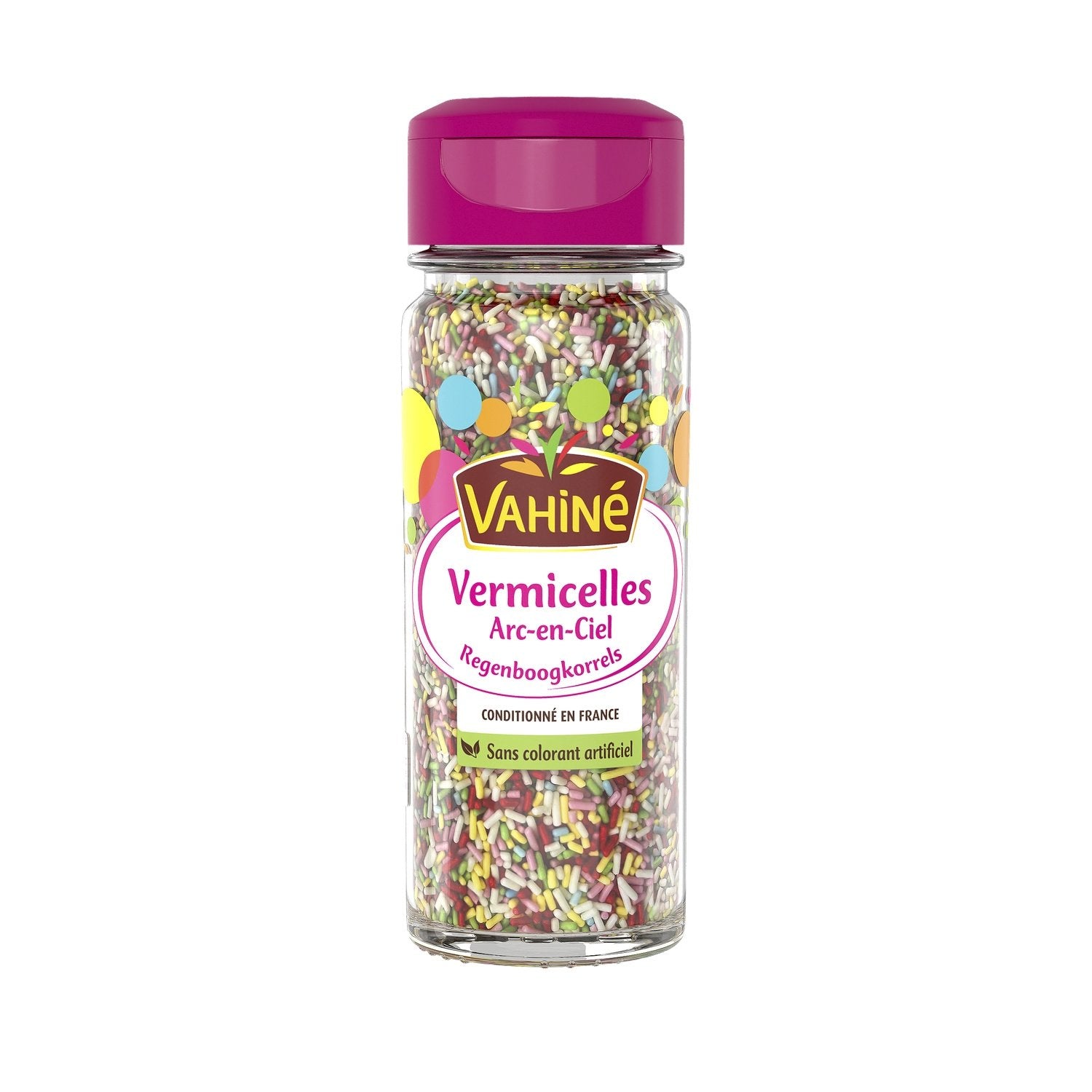 Les vermicelles arc-en-ciel Vahiné apporteront une touche de gaieté de de fantaisie à tous vos desserts en les décorant de mille couleurs. Les décors à parsemer Vahiné sont disponibles dans un flacon en verre muni d'un tamis : pratique pour saupoudrer toutes vos créations !