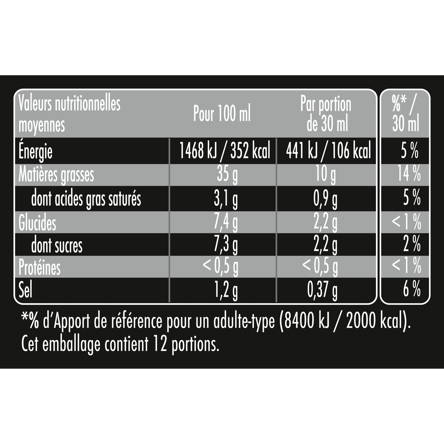 Vinaigrette allégée en matières grasses (35%). Réduite en matières grasses de 53% par rapport à une vinaigrette classique (75% MG) à 2850 kJ / 680 kcal pour 100 g.
