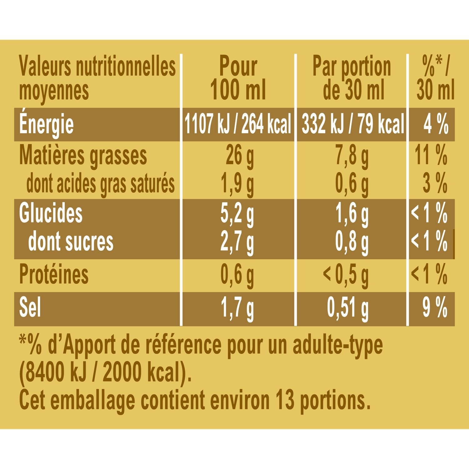 Vinaigrette allégée en matières grasses (26%) à la moutarde à l'ancienne aromatisée, et au miel. Réduite en matières grasses de 65% par rapport à une vinaigrette classique (75% MG) à 2850 kJ / 680 kcal pour 100 g.