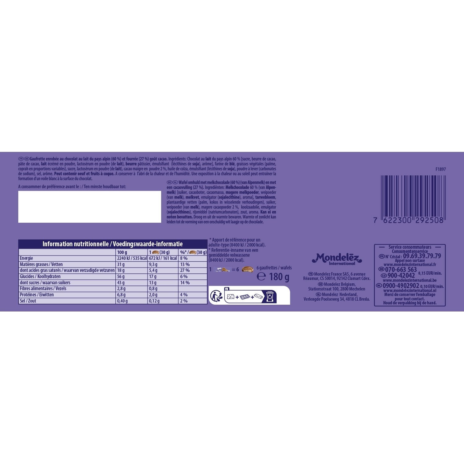 Gaufrette enrobée au chocolat au lait du pays alpin (60 %) et fourrée (27 %) goût cacao.