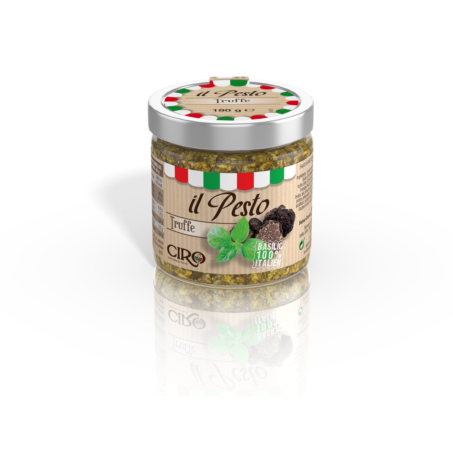 Huile de tournesol, basilic italien 35%, NOIX DE CAJOU, sel, truffe d'été (Tuber aestivum Vitt.) 1%, fromage Pecorino Romano AOP (LAIT de brebis, sel, présure), pignons de pin, ail, arôme, antioxydant (acide ascorbique), correcteur d'acidité (acide citrique).