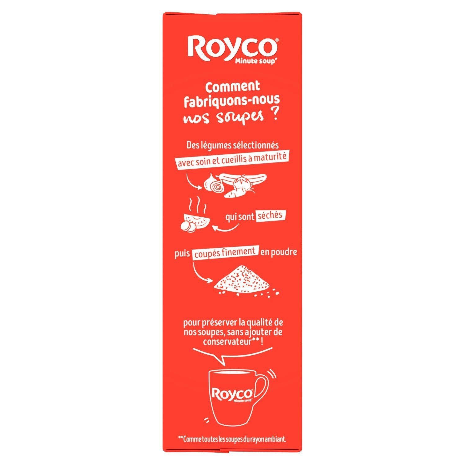 Depuis plus de 60 ans, Royco met en oeuvre son savoir-faire pour vous proposer des soupes individuelles toujours plus gourmandes et réconfortantes. Comment fabriquons-nous nos soupes en sachet ? Des légumes sélectionnés avec soin et cueillis à maturité, qui sont séchés, puis coupés finement en poudre, pour préserver la qualité de nos potages velouté ou mouliné, sans ajouter de conservateur*! *Comme toutes les soupes du rayon ambiant. Quel est le secret d'une délicieuse soupe Royco ? Notre savoir-faire français Variez les plaisirs Royco Crémeux champignons Royco Extra craquant légumes & croûtons