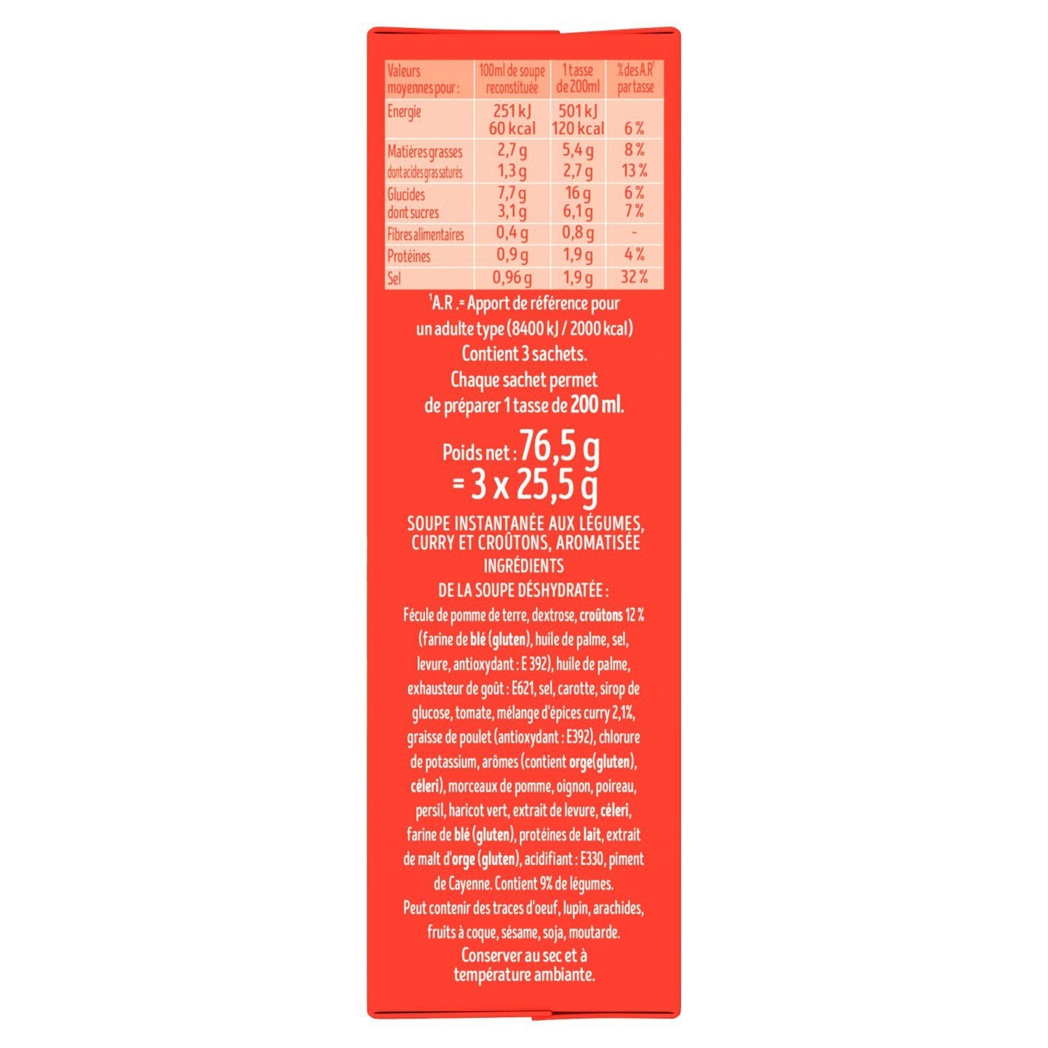 Ingrédients de la soupe déshydratée: fécule de pomme de terre,dextrose,CROÛTONS 12% (farine de BLÉ (GLUTEN), huile de palme, sel, levure, antioxydant : E 392),huile de palme,exhausteur de goût : E621,sel,carotte,sirop de glucose,tomate,mélange d'épices curry 2,1%,graisse de poulet (antioxydant : E392),chlorure de potassium,arômes (contient ORGE(GLUTEN), CELERI),morceaux de pomme,oignon,poireau,persil,haricot vert,extrait de levure,CELERI,farine de BLÉ (GLUTEN),protéines de LAIT ,extrait de malt d'ORGE (GLUTEN),acidifiant : E330,piment de Cayenne,Contient 9% de légumes.. Peut contenir des traces d'OEUF, lupin, ARACHIDES, FRUITS A COQUE, SESAME, SOJA, MOUTARDE.